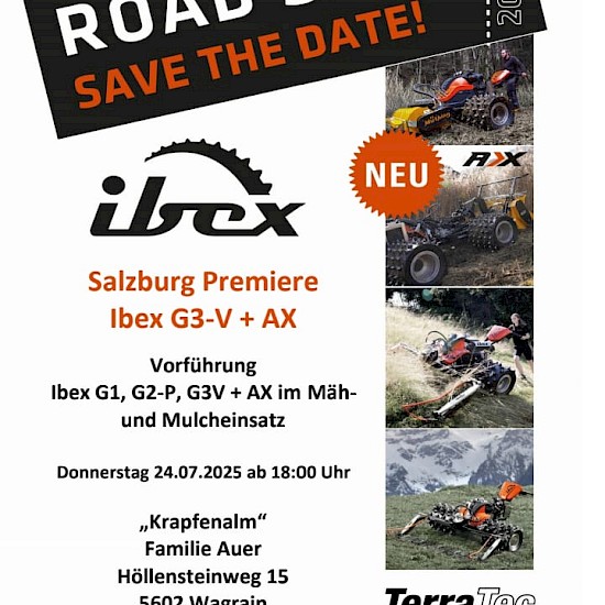 In Zusammenarbeit mit TerraTec und Kreer Landtechnik laden wir alle Kunden, Partner und Technikbegeisterten herzlich zu unseren beiden Roadshow-Terminen ein. Erleben Sie live die beeindruckende Performance der neuen Ibex-Serie, inklusive der Modelle G1, G2-P, G3V und dem neuen AX im anspruchsvollen Mäh- und Mulcheinsatz.