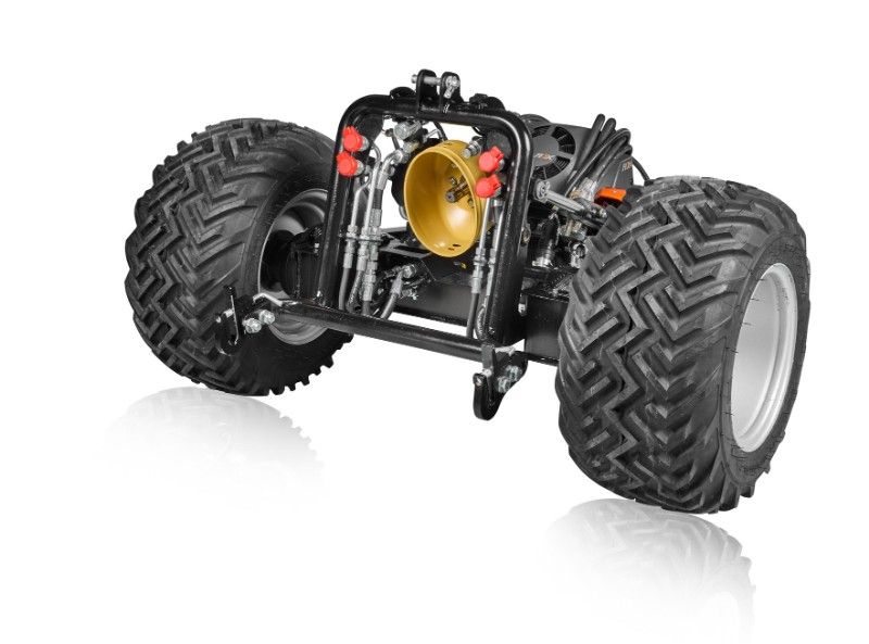 Die Achse lässt sich während der Fahrt über zwei Tasten verstellen. So lassen sich einerseits schwere Anbaugeräte, zum Beispiel zum Überfahren von Hindernissen, leicht ausheben. Andererseits bäumt sich die Maschine auch im steilen Gelände nicht so leicht auf.Hydraulik