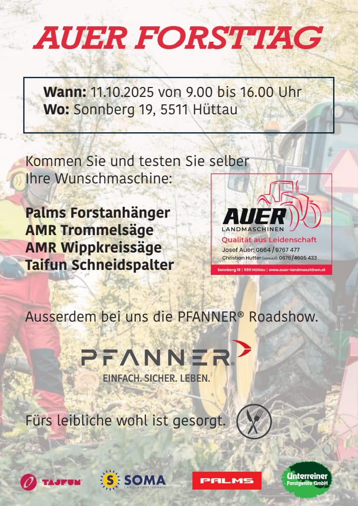 Am 11. Oktober 2025 von 9:00 bis 16:00 Uhr laden wir euch herzlich zum diesjährigen Auer Forsttag nach Sonnburg 19, 5511 Hüttau ein. Nutzt die einmalige Gelegenheit, verschiedene Forstmaschinen…